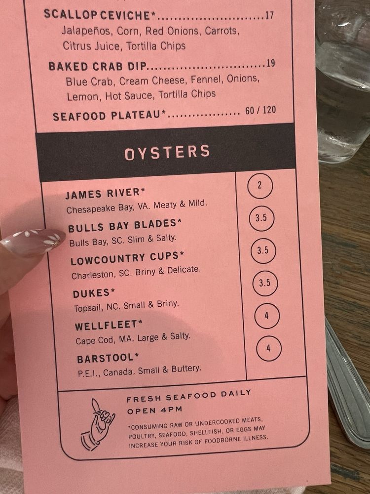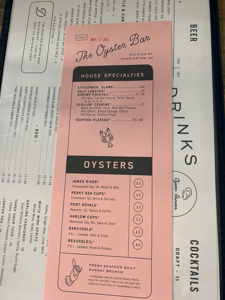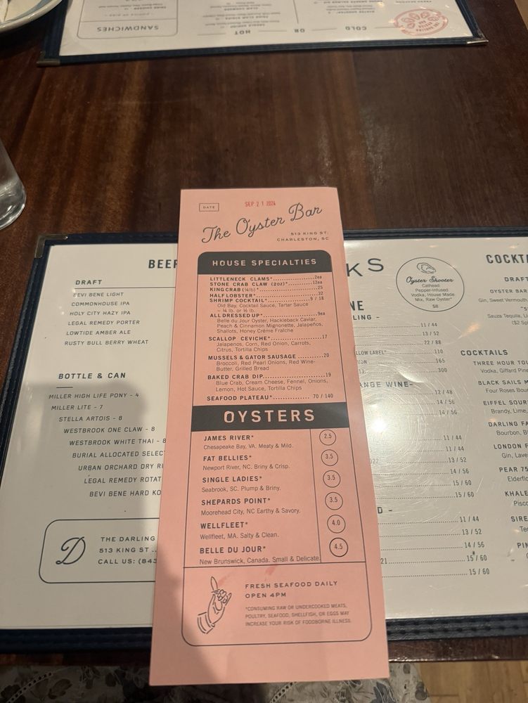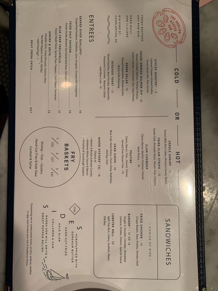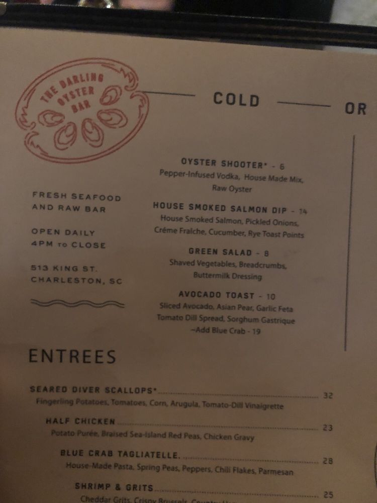 The Darling, located in Charleston, SC, is a trendy and romantic restaurant offering live/raw food, seafood, and a full bar. The menu boasts fresh seafood dishes like lobster rolls, diver's scallops, and blue crab pasta. Customers rave about the quick service, fresh food, and unique flavor combinations, such as mustard creole shrimp and hushpuppies with sorghum butter. The atmosphere is welcoming and tasteful, with options for outdoor seating and private dining. Happy hour specials and a diverse drink menu, including Pisco, add to the dining experience. Overall, The Darling is highly recommended for those seeking a top-notch Charleston seafood experience in a classy yet casual setting.